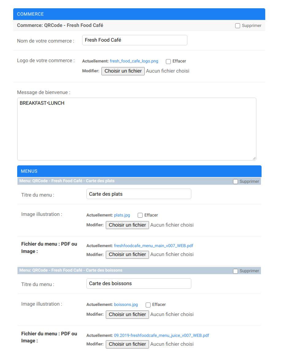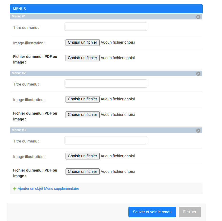 - Vous ajoutez autant de menus que vous le souhaitez en leur donnant un titre, une image d'illustration éventuelle et votre fichier PDF (ou image) contenant le détail de votre menu.